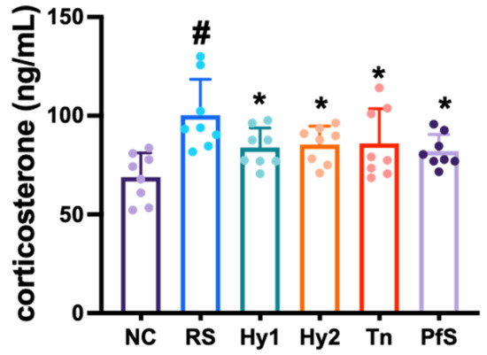 Effects of L. casei HY2782, B. lactis HY8002, L-theanine, and their supplement on corticosterone level in RS-exposed mice. Test agents (RS, saline; Hy1, HY2782; Hy2, HY8002; Tn, L-theanine; PfS, probiotics-fermented L-theanine-containing supplement) were orally gavaged. NC mice were treated with vehicle. n = 8. # p < 0.05 vs. NC. * p < 0.05 vs. RS.