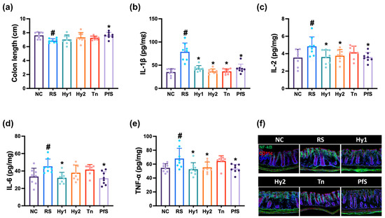 Effects of L. casei HY2782, B. lactis HY8002, L-theanine, and their supplement on RS-induced GI in mice. Effects on colon length (a), IL-1β (b), IL-2 (c), IL-6 (d), and TNF-α (e) levels, and NF-κB+CD11c+ cell numbers (f). Test agents (RS, saline; Hy1, HY2782; Hy2, HY8002; Tn, L-theanine; PfS, probiotics-fermented L-theanine-containing supplement) were orally administered. NC mice were treated with saline. n = 8. # p < 0.05 vs. NC. * p < 0.05 vs. RS.