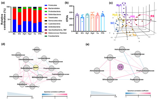 Effects of L. casei HY2782, B. lactis HY8002, L-theanine, and their supplement on RS-induced fecal microbiota alteration in mice. Effects on gut microbiota composition: (a), phylum level; (b), OTUs (α-diversity); (c), β-diversity (PCoA plot based on Jensen-Shannon analysis). The interrelation between gut microbiota and BDNF ((d), Spearman correlation coefficient) or IL-1β expression level ((e), spearman correlation coefficient). Test agents (RS, saline; Hy1, HY2782; Hy2, HY8002; Tn, L-theanine; PfS, probiotics-fermented L-theanine-containing supplement) were orally gavaged. n = 8.