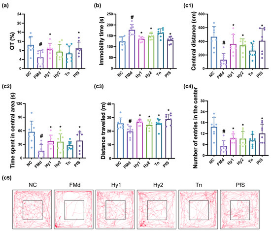 Effects of L. casei HY2782, B. lactis HY8002, L-theanine, and their supplement on FMd-induced DA-like behaviors in mice. Behaviors were assessed in the EPMT (a), TST (b), and OPT (c: (c1), CD; (c2), CT; (c3), TN; (c4), CN); (c5), track path). Test agents (FMd, saline; Hy1, HY2782; Hy2, HY8002; Tn, L-theanine; PfS, probiotics-fermented L-theanine-containing supplement) were orally gavaged. NC mice were treated with vehicle (saline) instead of test agents. n = 8. # p < 0.05 vs. NC. * p < 0.05 vs. FMd.