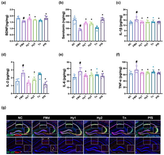 Effects of L. casei HY2782, B. lactis HY8002, L-theanine, and their supplement on FMd-induced neuroinflammation in mice. Effects on hippocampal BDNF (a), serotonin (b), IL-1β (c), IL-2 (d), IL-6 (e), and TNF-α levels (f), and NF-κB+Iba1+ and BDNF+NeuN+ cell numbers (g). Test agents (FMd, saline; Hy1, HY2782; Hy2, HY8002; Tn, L-theanine; PfS, probiotics-fermented L-theanine-containing supplement) were orally gavaged. NC mice were treated with vehicle (saline). n = 8. # p < 0.05 vs. NC. * p < 0.05 vs. FMd.