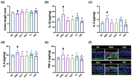 Effects of L. casei HY2782, B. lactis HY8002, L-theanine, and their supplement on FMd-induced GI in the colon of mice. Effects on colon length (a), IL-1β (b), IL-2 (c), IL-6 (d), and TNF-α (e) levels, and NF-κB+CD11c+ cell number (f). Test agents (FMd, saline; Hy1, HY2782; Hy2, HY8002; Tn, L-theanine; PfS, probiotics-fermented L-theanine-containing supplement) were orally gavaged. Normal control (NC) was treated with saline. n = 8. # p < 0.05 vs. NC. * p < 0.05 vs. FMd.