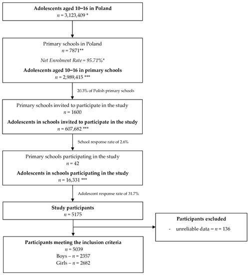 The population-based sample of primary school students was recruited for the study based on the same procedure used in the first phase of the DAY-19 Study [24,25,26]. The cluster sampling of participants from counties and schools was conducted in two stages: random sampling of counties from all voivodeships in Poland (voivodeships are the main administrative units of Poland), and random sampling of primary schools from previously sampled counties. In the first stage, 10 counties were sampled from each of the 16 voivodeships, and in the second, 10 schools were sampled from each county. The principals of schools were asked about their willingness to participate in the study, and they received the study protocol with all the necessary details. Finally, 42 primary schools participated and provided the informed consent of students and their parents/legal guardians who wanted to participate; for students and their parents/legal guardians, participation was voluntary. The students who provided informed consent received a link to the electronic questionnaire of the study, using the Computer-Assisted Web Interview (CAWI) method to gather the necessary data.