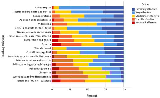 Preferred teaching techniques were a mixture of kinaesthetic (e.g., demonstrations, applied ‘hands-on’ activities), aural (e.g., open discussions with the facilitator), and visual techniques (e.g., charts, diagrams, infographics). Teaching techniques related to reading, writing, or recording (e.g., self-monitoring with mobile applications, workbooks) were less preferred. Teaching techniques involving competition (e.g., competitions/games, debates) showed a mixed response (Figure 1).