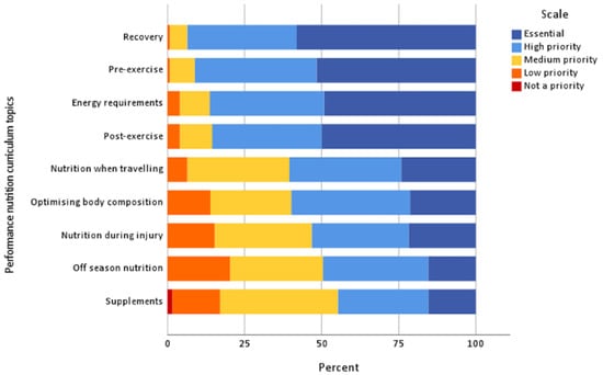 Priority of performance nutrition curriculum topics to be included in NE (n = 124). Note: not shown are unsure responses (n = 4, 0.4%) for this section.