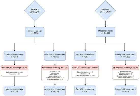 The total NHANES 2015–2016 sample for analysis comprised n = 5264 participants with a full data set, of which n = 132 reported soy milk consumption. This may be extrapolated to represent n = 4,427,078 US Americans. The NHANES 2017–2020 pre-pandemic cycle included n = 8511 participants with a full dataset, of which n = 187 reported soy milk consumption. This may be extrapolated to represent n = 3,460,784 US Americans. Figure 1 shows the participant inclusion flow chart for the 2015–2016 cycle on the left side and for the NHANES 2017–2020 pre-pandemic cycle on the right side.