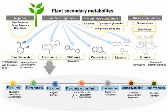 Plant secondary metabolites. Four groups of major secondary metabolites which can be found in plants. The focus of this review is on phenolic compounds (phenolic acids, flavanoids, stilbenes, coumarins, lignans, and tannins) and their flavonoid subset (flavonols, flavononols, flavones, flavanols, flavanones, anthocyanidins, and isoflavonoids).