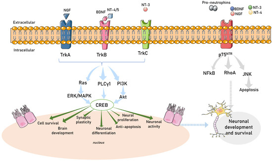 All neurotrophins have low affinity for the p75 neurotrophin receptor (p75NTR). Neurotrophins and each of their proforms are bound by the extracellular domain. The outcomes of p75NTR activation are influenced by interactions with other receptors. Due to the absence of enzymatic activity in its cytoplasmic domain, p75NTR does not signal via conventional channels. Therefore, interactors of the intracellular domain or interacting proteins that are attracted to or connected with the receptor contribute to the signaling of the p75NTR including apoptosis [193,194], p53 activation via the Jun kinase signaling cascade, and activation of NF-κB for neuronal survival [195] and axonal development [196]. p75NTR activation is also influenced by interactions with other receptors and transmembrane proteins [197,198]. p75NTR has a beneficial effect on cell survival by promoting ceramide production [199]. Ceramide controls ERK/MAPK, PI3K/Akt, Jun kinase, and NFkB signaling pathways [200].