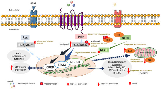 6-gingerol suppression and activation of Akt/STAT3 to suppress proinflammatory cytokine release and Akt/CREB to promote BDNF gene expression. Ginger root extract ameliorated microglia-mediated neuronal insults via upregulating the expression of Bax and reducing the expression of Bcl-2. Ginger root extract suppressed NF-κB and AKT/STAT3, and the MAPK pathway in the neuroinflammatory response.