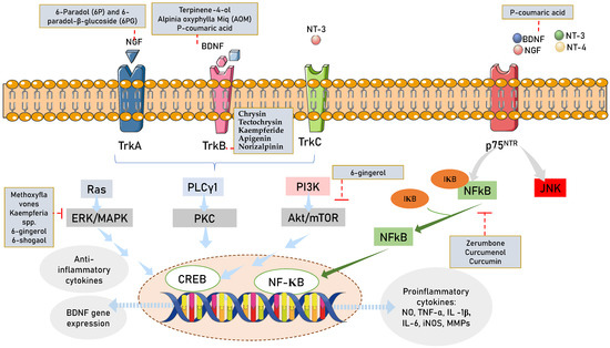 Zingiberaceae targeting neurotrophin intracellular signaling pathways. Legends for figure: Akt—Ak strain transforming; NGF—nerve growth factor; BDNF—brain derived neurotrophic nerve factor; TrkA—tropomyosin-related kinase A; TrkB—tropomyosin-related kinase B; TrkC—tropomyosin-related kinase C; NT3-neurotrophin 3; NT4/5—neurotrophin 4/5; PLCγ1—phospholipase C-γ1; ERK/MAPK—extracellular signal-regulated kinase/mitogen-activated protein kinase; CREB-cAMP—response element binding protein; P75NTR—p75 neurotrophin receptor; NFKB—nuclear factor-κB; RhoA—ras homolog family member A; JNK—c-Jun N-terminal kinases.