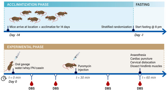 On the experimental day, mice received an oral gavage (end volume 0.5 mL) containing approximately 70 mg protein (0.75 g∙kg−1 body weight). Protein contents of casein and P4 (35% whey, 25% casein, 20% pea and 20% soy) were matched to whey protein content (see Table 1), and an equal amount of tap water was used as a fasted control. The amount of protein provided to the mice mimics an effective amount of 20 g whey protein to stimulate MPS in elderly humans [22], taking into account the daily protein recommendation of humans and mice [23]. Thirty minutes after oral gavage, mice received a s.c. injection with 0.04 mmol∙g−1 body weight puromycin (Sigma-Aldrich, Merck, Zwijndrecht, The Netherlands) (Figure 1) [24]. In between animal handling, mice were returned to their home cages, where they were permitted free access to water only. After an additional 30 min, a maximal 1000 µL of blood was drawn by cardiac puncture under total isoflurane anaesthesia (isoflurane/N2O/O2), after which cervical dislocation was applied. During the postprandial period of cohort 2, 1–2 droplets of blood obtained via tail cut were stamped directly on a protein saver card at 10, 20, 45 and 60 min. Whole blood was collected in heparin-coated tubes (12.8 µL heparin (Heparine Leo 5000 I.E.∙mL−1 from a local Pharmacia, The Netherlands) and 7.2 µL of PBS). Plasma samples were prepared by centrifugation and collecting the plasma for amino acid analyses. Finally, MPS was measured after a 60 min postprandial period (SUnSET method [20]). The muscles from the hind limb were excised, weighed, snap-frozen in liquid nitrogen and stored at −80 °C until combined analyses. A schematic illustration of the animal experiment is shown in Figure 1.