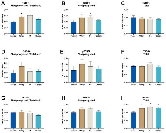 Signal transduction proteins involved in the protein machinery in the TA after overnight fasting (Fasted) or supplementation with whey, P4 or casein. (A) 4EBP1 ratio between phosphorylated and total 4EBP1, (B) phosphorylated protein of 4EBP1, (C) total protein of 4EBP1, (D) p70S6K ratio between phosphorylated and total p70S6K, (E) phosphorylated protein of p70S6K, (F) total protein of p70S6K, (G) mTOR ratio between phosphorylated and total mTOR, (H) phosphorylated protein of mTOR, and (I) total protein of mTOR. Values are means ± SEM of both experiments and are expressed as a relative ratio to the fasted control group. * p < 0.05 compared to the fasted control group.