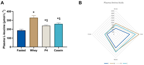 Plasma leucine levels at 60 min, as shown in Figure 5A, were significantly increased after supplementation with whey (1.8-fold increase, p < 0.0001), P4 (1.3-fold increase, p = 0.0401) and casein (1.4-fold increase, p = 0.006) compared to fasted, however with whey the increase was significantly higher than with P4 or casein (p < 0.001) (Figure 5A). The complete dataset is available in Appendix A Table A1.