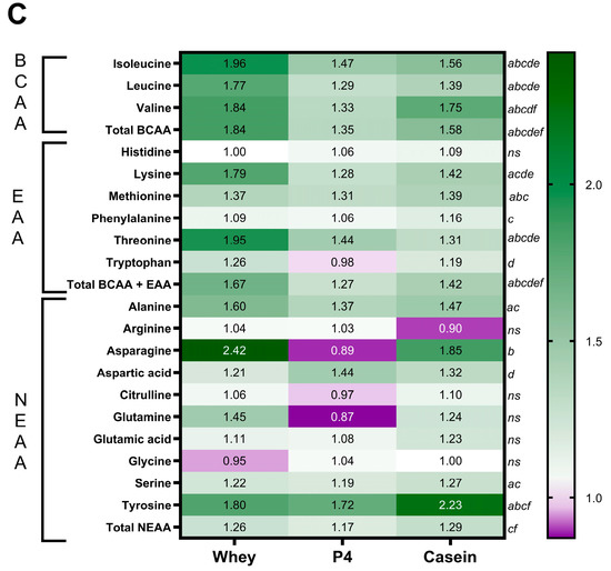 Postprandial amino acid concentrations in plasma. (A) Plasma leucine concentrations at 60 min. Values are means ± SEM, * p < 0.05 compared to fasted; $ p < 0.05 compared to whey. (B) Radar plot of plasma BCAA, EAA, CEAA and NEAA concentrations. (C) Heatmap of plasma amino acid ratios compared to the fasted group. Significances in the heatmap (p < 0.05) are shown by a: fasted to whey, b: fasted to P4, c: fasted to casein, d: whey to P4, e: whey to casein and f: P4 to casein, ns is not significant, as indicated next to the casein column.