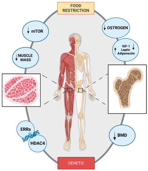 Bone and muscle implications in AN influenced by genetics and food restriction; BMD: bone mineral density; mTOR: mammalian target of rapamycin; HDAC4: histone deacetylase 4; IGF-1: insulin grown factor 1; ERRs: estrogen-related receptors.