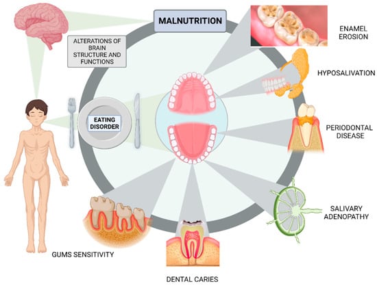 The oral cavity may be the principal site of involvement in endocrine, renal, gastrointestinal, cardiovascular, hematological, autoimmune cutaneous, and psychological illnesses. EDs are psychosomatic disorders with complex etiologies and aberrant eating behaviors []. Brain alterations in AN were discovered decades ago, with the most prevalent result being a loss in grey and white matter that correlates with the severity of malnutrition and is typically reversible upon recovery (Figure 2) []. In many situations, the oral cavity may be the only region where eating disorders occur. The medical complications linked to these disorders (dehydration, electrolyte abnormalities, abnormal heart activity, gastrointestinal complications, endocrine disorders, osteopenia, and increased risk of fertility problems) have been well described in the medical literature for many years []. Nevertheless, the effects of eating disorder behaviors on the teeth and oral tissues were not recognized until more recently [,].