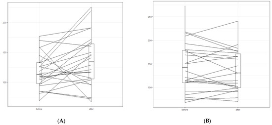 Change in LDL-C concentration [mg/dL] of each participant before and after dietary intervention in the lipedema and the overweight/obesity group. (A) lipedema group; (B) obesity group.