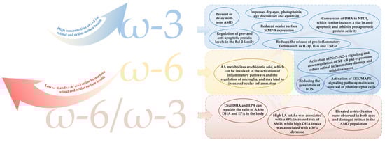 The combined intake of ω-6 and ω-3 has been reported to significantly modulate the amount or ratio of PUFAs in the body, thus reducing the extent of damage to the retina [114,115]. Dietary supplementation with DHA and EPA can effectively regulate the ratio of AA, DHA and EPA in the body [116]. High levels of LA intake can significantly reduce the risk of AMD; conversely, high levels of DHA intake are negatively associated with the risk of AMD [117]. In addition, EPA + DHA + GLA diet significantly reduced the activation of glial cells in retina-damaged rats compared to EPA + DHA or GLA supplementation alone, and it was effective at protecting the structural integrity of the retina [96]. These studies suggest that diets with different combinations of ω-3 and ω-6 PUFAs may be more helpful at improving damaged retinas than single ω-3 PUFAs or ω-6 PUFAs supplementation, suggesting that the modulation of ω-3 PUFAs levels and the ratio of ω-6/ω-3 PUFAs are important in the function of retinal protection. A stable ω-6/ω-3 ratio in the range of 1:1 to 4:1 in the diets of animals and humans has been reported to be an appropriate balance ratio and more conducive to the health of the organism [118]. However, an optimal range for the ω-6/ω-3 ratio has not been clearly reported in studies on the eye.