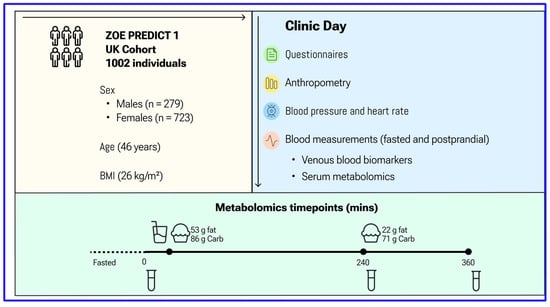 The ZOE PREDICT 1 study (NCT03479866) was a single-arm, single-blinded study (June 2018 to May 2019) in 1102 healthy adults, aged 18–65 y (n = 1002 from the United Kingdom (UK); for the full protocol, see Berry et al. [15]. The study was conducted between 5 June 2018 and 8 May 2019, with participants recruited from the TwinsUK cohort, an ongoing research cohort described elsewhere [16] and through online advertising. The study consisted of a 1-day clinical visit at baseline followed by a 13-day at-home period, although this paper only focuses on the 1-day clinical visit. Primary outcomes are reported elsewhere [13,14]. Secondary outcome metabolomic data measured by NMR (at the baseline visit only) was reported previously [17] and in this paper. At baseline (day 0), participants arrived fasted and were given a standardised metabolic challenge meal for breakfast (0 h; 86 g carbohydrate, 53 g fat, 16 g protein; 3.7 MJ) and a test lunch (4 h; 71 g carbohydrate, 22 g fat, 10 g protein; 2.2 MJ). The fat was high oleic sunflower oil; 85% oleic acid (18:1n − 9) and 8% linoleic acid (18:2n − 6). Fasting and postprandial (0–6 h) venous blood was collected to determine concentrations of serum glucose, insulin, TG and metabolomics (using NMR described below). The trial was approved in the UK by the Research Ethics Committee and Integrated Research Application System (IRAS 236407), registered on ClinicalTrials.gov (NCT03479866) and was run in accordance with the Declaration of Helsinki and Good Clinical Practice. Participants provided informed written consent before taking part in the study and individual participants could not be identified following data collection.