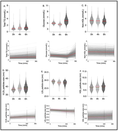 Postprandial Change: Postprandially, 83% of the 250 metabolite outcomes measured had a significant absolute change at 4 h from fasting (43% with a significant increase and 57% with a significant decrease; Kruskal–Wallis FDR < 0.05), and 85% had a significant absolute change at 6 h from fasting (47% with a significant increase and 53% with a significant decrease; Kruskal–Wallis FDR < 0.05). The majority (95%) of those with a significant change at 4 h were also significantly changed at 6 h, while 8% of those that changed at 6 h were not different between fasting and the 4 h postprandial timepoints. At 6 h, 37 of the 250 metabolites changed by >25% from fasting values (30 increased and seven decreased by >25%), of which 14 changed by >50% from fasting values (12 increased and two decreased by >50%) (Supplementary Table S2; median % change). The largest postprandial increases (median % change; 0–6 h) were elicited in the XXL-VLDL particles, specifically particle number (XXL-VLDL-P; 440%), TG (XXL-VLDL-TG; 676%), phospholipid (XXL-VLDL-PL; 570%) and total lipid (XXL-VLDL-L; 379%) concentrations. The largest postprandial decreases (median % change; 0–6 h) were observed in ketone bodies (β-hydroxybutyrate: −85%, acetoacetate: −49%, acetate: −40%, acetone: −400%) and the percentage contribution of cholesterol (esters (CE) and total (C)) to XL-VLDL (XL-VLDL-CE: −57%, XL-VLDL-C: −46%). Traditional clinical measures (TG, glucose and non-HDL), lipoprotein particle sizes (due to their strong association with disease risk) and the variables with the largest postprandial change (>25%; 0–6 h), within each class of metabolite, are shown in Figure 2 and Figure 3.