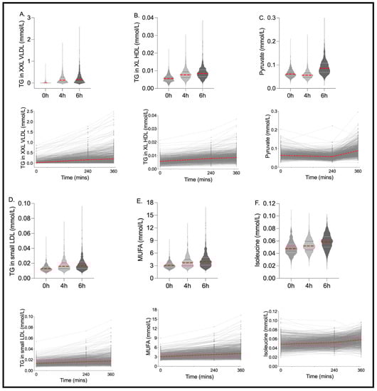 Metabolites with the greatest postprandial change and/or postprandial inter-individual variability. Fasting and postprandial concentrations of (A) triglycerides in extremely large VLDL particles and chylomicrons (TG in XXL VLDL), (B) triglycerides in large HDL particles and chylomicrons (TG in XL HDL), (C) triglycerides in LDL particles and chylomicrons (TG in LDL), (D) pyruvate, (E) mono-unsaturated fatty acids (MUFA), (F) isoleucine. n = 1002. Red lines show the median value.