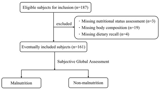 A total of 187 CKD patients hospitalized in the Department of Nephrology of the First Medical Center of the Chinese People’s Liberation Army General Hospital from March 2022 to September 2022 were selected. After excluding 3 cases without nutritional status assessment, 19 cases without body composition, and 4 cases missing dietary recall, 161 subjects were finally included. The subject screening process is shown in Figure 1.