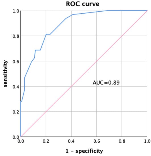 According to the results of multivariate logistic regression analysis of CKD malnutrition, the score Logit(P) and the prediction probability P of multiple indicators combined for the diagnosis of CKD malnutrition were calculated (Equations (1) and (2)). The area under the curve (AUC) of the prediction probability was 0.89 (95% confidence interval (CI): 0.834–0.946, p < 0.001), as shown in Figure 3.