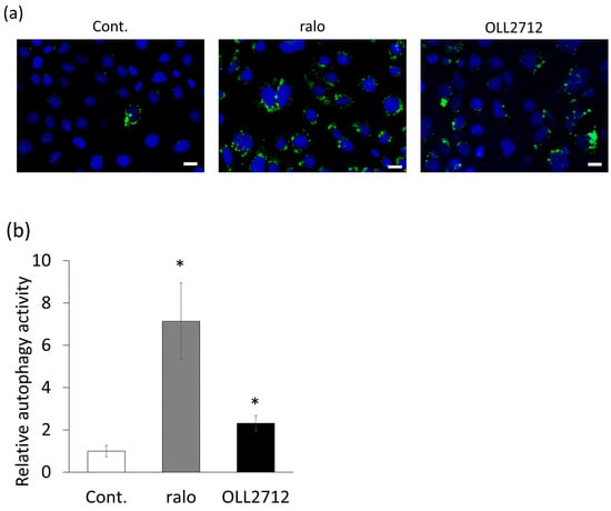Lactiplantibacillus plantarum OLL2712 (OLL2712) increased autolysosome puncta in intestinal epithelial cells. (a) Fluorescent microscopic images of autolysosome puncta in Caco-2 cells detected with DALGreen and (b) the fluorescent intensities of autolysosomes per cell (n = 10). Scale bars were 20 µm. Data are shown as the relative level to the control. *: p < 0.05 vs. control. Cont.: control; ralo: raloxifene.