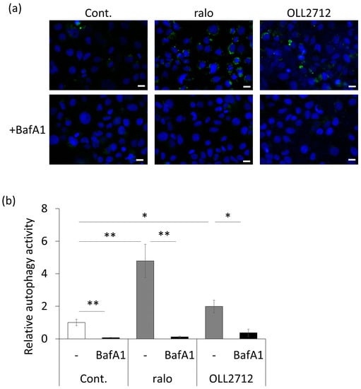 Autophagy induced by OLL2712 was suppressed by the autophagy inhibitor bafilomycin A1. (a) Fluorescent microscopic images of autolysosome puncta in Caco-2 cells, in which autophagy was inhibited by bafilomycin A1 and was detected with DALGreen, and (b) the fluorescent intensities of autolysosomes per cell (n = 7–10). Scale bars were 20 µm. Data are shown as the relative level to the control. *: p < 0.05, **: p < 0.01. Cont.: control, ralo: raloxifene, BafA1: bafilomycin A1.
