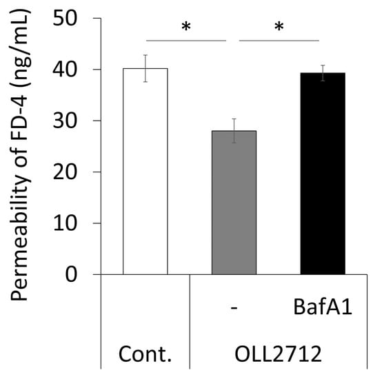 Some LAB can improve intestinal barrier function both in vitro and in vivo [11,28,29]. The relationship between autophagy and intestinal barrier function showed that the activation of autophagy strengthened tight junctions [30]. Therefore, we investigated whether the induction of autophagy by OLL2712 affected intestinal barrier function. We tested the FD-4 permeability from the apical side to the basolateral side using Caco-2 monolayers. They were stimulated with OLL2712 in the absence or presence of bafilomycin A1 for 24 h; then, they were challenged with FD-4. The result revealed that OLL2712 suppressed FD-4 permeation, whereas bafilomycin A1 inhibited this effect (Figure 4). In an independent experiment, the addition of bafilomycin A1 alone had no effect on the permeation (Figure S3a). This suggests that autophagy activation by OLL2712 contributes to the strengthening of the mucosal barrier in Caco-2 cells.
