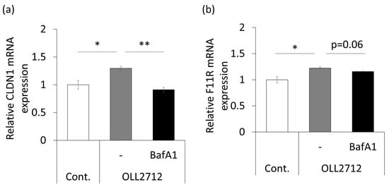 OLL2712 increased tight junction-related gene expression via autophagy. (a,b) Relative mRNA expression of the tight junction-related gene in Caco-2 monolayers. Total mRNA was extracted from the Caco-2 monolayers after 9 h of stimulation. (a) CLDN1 and (b) F11R were normalized with GAPDH, and data are shown as the relative expression to the control (n = 3). *: p < 0.05, **: p < 0.01 vs. OLL2712. Cont.: control, BafA1: bafilomycin A1.
