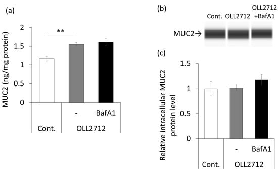 The mucus layer on intestinal epithelial cells constitutes a physical barrier in vivo [31]. To investigate whether OLL2712 affects mucin secretion in goblet cells via autophagy, we quantified mucin levels by ELISA after 72 h of stimulation in HT-29-MTX-E12 cells, a cell line that secretes mucin-like goblet cells [32]. Mucin secretion was significantly increased by OLL2712 stimulation; however, the autophagy inhibitor did not suppress mucin secretion (Figure 6a). OLL2712 promoted mucin secretion independent of autophagy. Additionally, although intracellular MUC2 levels were examined by Western blotting, there were no significant differences between the groups (Figure 6b,c). Therefore, we assumed that OLL2712 promoted extracellular mucin secretion, rather than enhancing its differentiation into goblet cells.