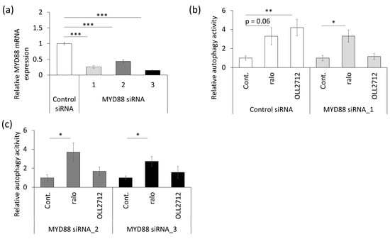 MYD88 is an adapter factor downstream of toll-like receptors (TLRs) and is involved in various signaling pathways, such as immune and inflammatory responses [33]. A previous study reported that MYD88 was required for autophagy induction in mouse small intestinal epithelial cells [34]. We hypothesized that autophagy activation by OLL2712 was also mediated by MYD88. To assess the involvement of MYD88, transient MYD88 knockdown was performed in Caco-2 cells using siRNA. First, we confirmed the effects of three types of MYD88 siRNAs used to knock down different sequences. The results showed that MYD88 expression was suppressed by 60% or more (Figure 7a). Second, we confirmed whether MYD88 knockdown inhibited autophagy promotion by OLL2712. Transient MYD88 knockout cells or control siRNA-transfected cells were stimulated with raloxifene or OLL2712 for 24 h. Control siRNA did not attenuate OLL2712-induced autophagy, whereas all three siRNAs inhibited it (Figure 7b,c). We verified that the siRNA transfection did not induce cytotoxicity (Figure S4). These results indicated that there were no off-target effects, and that OLL2712 activated autophagy via MYD88.