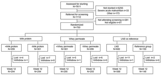 All caregivers, irrespective of study arm, received nutrition counselling at inclusion, in line with the national policy on infant and young child feeding []. Those randomized to the intervention arm received one LNS sachet of 100 g/day. The energy and macronutrient contents of the four LNS formulations were matched. Protein and carbohydrate constituted approximately 10% and 32% of the energy, respectively. Milk or soy protein constituted 50% of the total amount of protein, and WP or maltodextrin were added on top of a vitamin–mineral–mix in a peanut base. The LNS was manufactured and pre-packed by Nutriset (Malaunay, France) in coded zip-lock bags of 14 sachets. Each 100g LNS sachet provided ~535 kcal, which constituted up to half of the average daily energy requirements of a child and satisfied most of the daily micronutrient requirements (Supplementary Table S1). Those in the reference group received no supplement, and therefore continued with family diet only. The reference group received one 1 kg bar of laundry soap fortnightly. To discourage sharing, caregivers were informed that the LNS was only intended for the study child. In case of any siblings aged 6–59 months, the family received one extra ration of the same food supplement as the study child at each visit, irrespective of stunting status.
