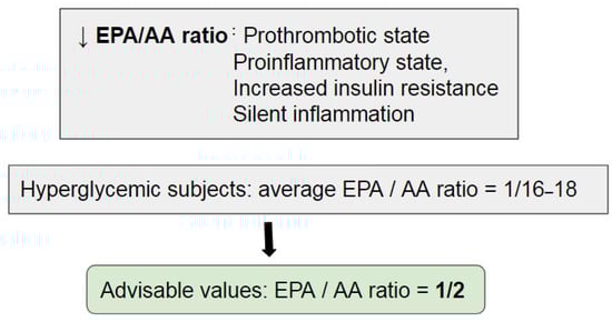 Indeed, hyperglycemic subjects have an average EPA/AA ratio of 1:16–18, while a value less than 1:2 should be advisable (Figure 3) [115].