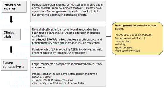 Summary of the evidence from pre-clinical, clinical studies and future perspectives. ω-3 FAs: Omega-3 Fatty Acids, EPA: Eicosapentaenoic Acid, AA: Arachidonic Acid, LA: Linoleic Acid, T2DM: Type 2 Diabetes Mellitus, DHA: docosahexaenoic acid.