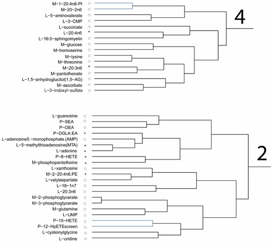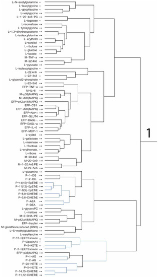 Values for compounds with the preceding letters P, L, and M refer to plasma, liver, and muscle, respectively. In addition, EFP is gene expression for epididymal fat pad qPCR values. Of the 651 variables analyzed, 211 showed variable importance in projections (VIP) Scores >1. The hierarchical cluster analysis was performed on the correlation matrix of these variables and the cluster dendrogram was pruned to describe six data clusters. The clusters are individually displayed, with VIP scores indicated for each variable at >1.75 (***), >1.5 (**), >1.25 (*), and >1 (◌). The dietary treatment DHA for mice fed the DHA diet and mice fed the control diet. The data shown reflect the metabolites measured in P, L, and M herein and included is a new data analysis of gene products, plasma eCB, and OxL measured in the mice from our laboratory [10]. The application of new data analysis with the metabolite levels in the current study helps to show the relationships between metabolites and molecular factors that influence macronutrient metabolism in mice.