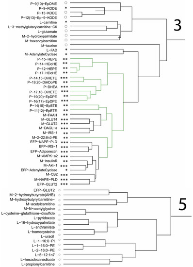 The hierarchical cluster analyses dendrogram are presented as six data clusters individually displayed with VIP scores indicated for each variable at >1.75 (***), >1.5 (**), >1.25 (*), and >1 (◌). Values for compounds with the preceding letters P, L, and M refer to plasma, liver, and muscle, respectively. EFP is epididymal fat pad qPCR values.