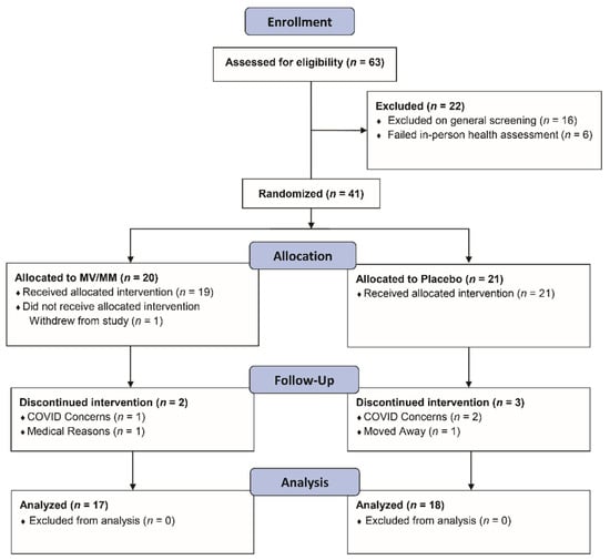Initially, 63 older men met the screening criteria, and of those, 41 were enrolled in the study; 35 study participants completed the study (Figure 1). Since the enrollment criteria were designed to select a group of healthy older men, there were no issues of concern noted on the initial laboratory screens. MV/MM- and placebo-supplemented participants did not significantly differ in baseline characteristics and blood chemistry, except for higher plasma HDL cholesterol concentrations and lower systolic blood pressure and plasma triglyceride concentrations in the MV/MM compared with placebo-supplemented participants (Table 1). Despite these initial differences, no changes in laboratory screens were noted throughout the study in either group (Table S2).