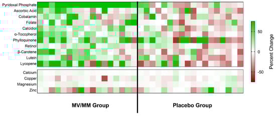 To assess the impact of MV/MM intake, blood samples from study participants were analyzed after the supplementation period, and comparisons were made within and between groups (Table 3). To visualize changes within individuals that were assigned to the two study groups, the percent change in blood micronutrient concentrations is displayed as a heat map (Figure 2).