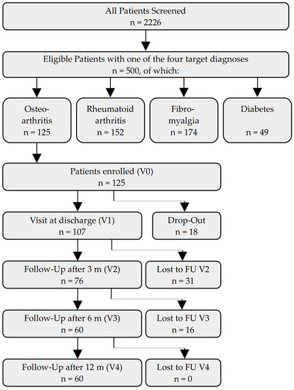 During the stay, n = 18 (14%) of the initial n = 125 patients discontinued participation in the study, leaving n = 107 patients for the V1 visit (86%). Between V1 and V2, the number of responding patients fell by n = 31 (25%) to n = 76 (61%), and n = 60 (48%) patients participated in the follow-up visits V3 and V4 (Figure 1).