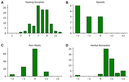 (A) Histograms of the fasting duration (in days) and changes to the intake of pain medications during the inpatient hospital stay: (B) opioids, (C) other pain medication, and (D) herbal remedies.