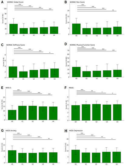 Questionnaire results. Results from the validated WOMAC Index (on the traditional 0–96 point scale) (A–D), WHO-5 (E), MAAS (F), and HADS (G,H) across the five visits (V0, V1, V2, V3, V4), i.e., at the beginning and the end of the fasting stay and after 3, 6, and 12 months. Higher values for WHO-5 (E) and MAAS (F) and lower values for all other scores indicate better results in terms of the patients’ health. Asterisks *, **, *** indicate tests with p < 0.05, p < 0.01, and p < 0.001, respectively.
