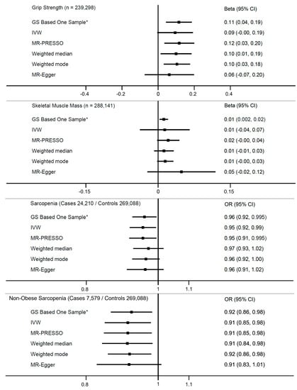 - Sutherland, J.; Zhou, A.; Hypponen, E. Muscle traits, Sarcopenia, and Sarcopenic Obesity: A Vitamin D Mendelian Randomization Study—Supplementary Appendix. Available online: https://data.mendeley.com/ (accessed on 6 June 2023).