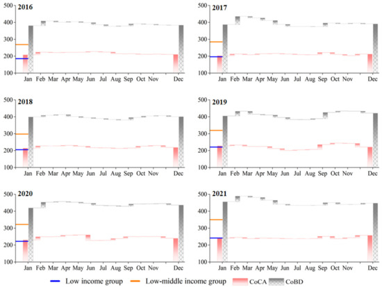 Here, and denote the affordability of SCA and SBD in t period, respectively. is the food cost of i income group in t period, and i includes the lowest-income and low-income groups. If (or ) > 1, it means that the shift to a calorie-adequate diet (balanced diet) to meet dietary recommendations for the vulnerable groups will increase food expenditure, i.e., the SCA (SBD) diet is less affordable and potentially threatens food security. Conversely, it means that the diet is affordable at the current expenditure.