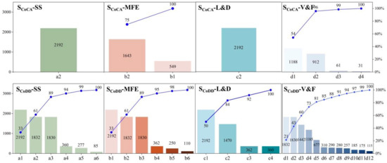 Figure 4 shows the frequency and cumulative frequencies of the various food items during the period from 2016 to 2020 (a total of 2192 days). The O&F category is not discussed in this section, as it includes only soybean oil in all dietary scenarios. A total of nine foods are included in the SCA, all of which had the lowest cost per calorie among the food groups at any given time. Of these, SS and L&D include only one type of food each, namely, standard grade flour and black beans. There are differences in the degree of variation of the different foods in the V&F and MFE categories, leading to the occurrence of least-cost substitution. The highest to lowest frequencies in the V&F category are carrots, bananas, garlic moss, and cabbage, which means that carrots and bananas were the least expensive choices among the fruits and vegetables most of the time. The frequency of bone-in pork in the MFE category is almost three times higher than that of eggs. It can be seen that bone-in pork is the least-costly MFE option, and eggs are the least-costly alternative during the pork price increase (e.g., after February 2020).
