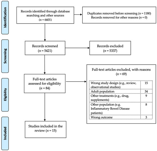 In total, 84 full-text studies were assessed for eligibility. Of those, 15 clinical trials met the inclusion and exclusion criteria and were selected for the present systematic review. In specific, six studies evaluated the efficacy of a low-FODMAP diet [36,37,38,39,40,41,42], five evaluated the efficacy of FRD/LRD [28,43,44,45,46], three trials evaluated the efficacy of the GFD [47,48,49], and one evaluated the efficacy of the MD [50]. The flowchart of the eligible studies is shown in Figure 1.