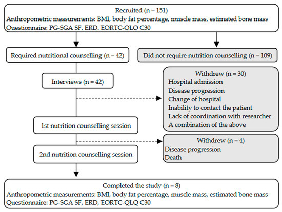 Figure 1 shows the overall research plan. The present qualitative analysis was conducted on the data obtained from the interviews with patients. Table 1 illustrates the patients’ characteristics. Of the 151 patients, 42 (27.8%) required nutrition counselling. There was no significant effect of sex, performance status, cancer site, or BMI on whether patients required nutrition counselling. Of the 42 patients who required nutrition counselling, only 8 (19.0%) completed both sessions. Patients dropped out of the study owing to death, transfer to another hospital, deterioration of their medical condition, loss of contact, and lack of coordination with the researcher.