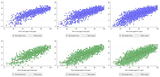 Table 3 shows crude DQS and FNI scores in males, whereas Table 4 shows both crude metrics in women. Both the DQS and FNI differed significantly across the three DQ groups. We found a significant linear trend for both (crude) metrics in both sexes, indicating higher scores in participants with an excellent/very good DQ and lower scores in participants with a poor DQ. Scatterplots (Figure 2) suggested a strong correlation between the DQS and the FNI across all age groups and in both sexes (Pearson’s product-moment correlation coefficients ranged from r = 0.81 to r = 0.84, p < 0.001 for all).