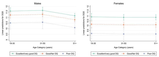 Marginsplots were used to graph statistics from the fitted models. Marginal predicted values of DQS are shown in Figure 3 by DQ category for each age category in males on the left (based on model 2, Table 5) and females on the right (based on model 2, Table 6). Figure 3 suggests sex-specific differences in the relationship between self-perceived DQ and measured DQ as assessed by the DQS. The magnitude in age-specific DQS differences was more pronounced in women.
